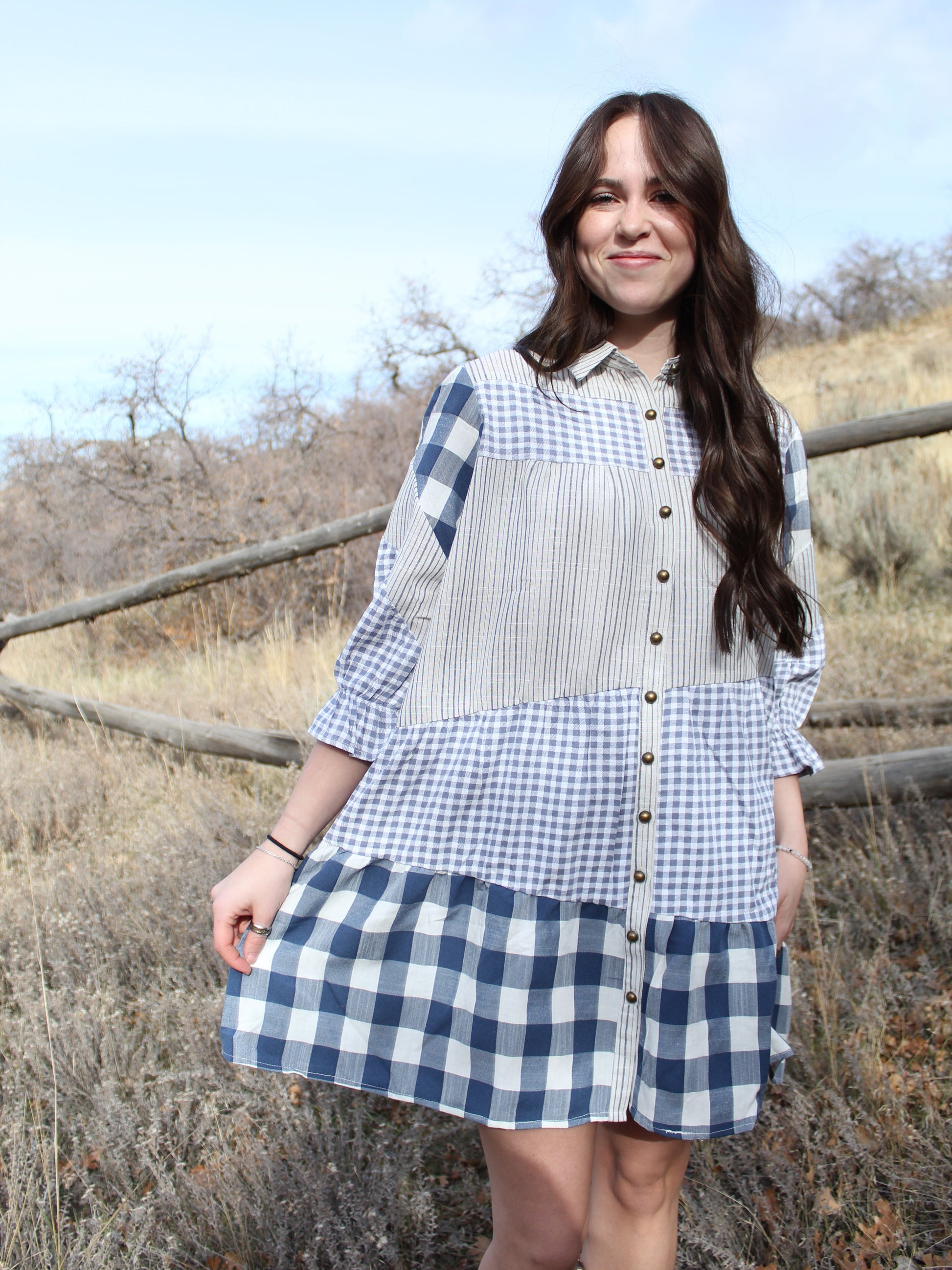Features: Blue checkered, striped and plaid contrasting dress, 3/4 ruffle sleeves, button up, collared, asymmetrical design